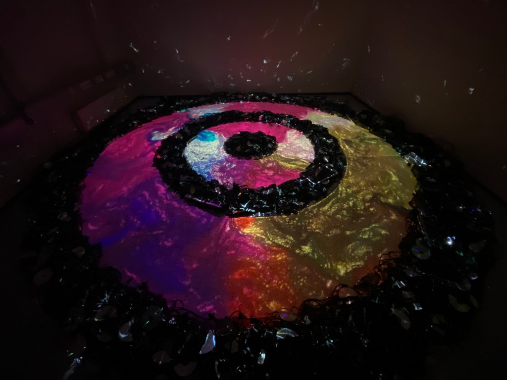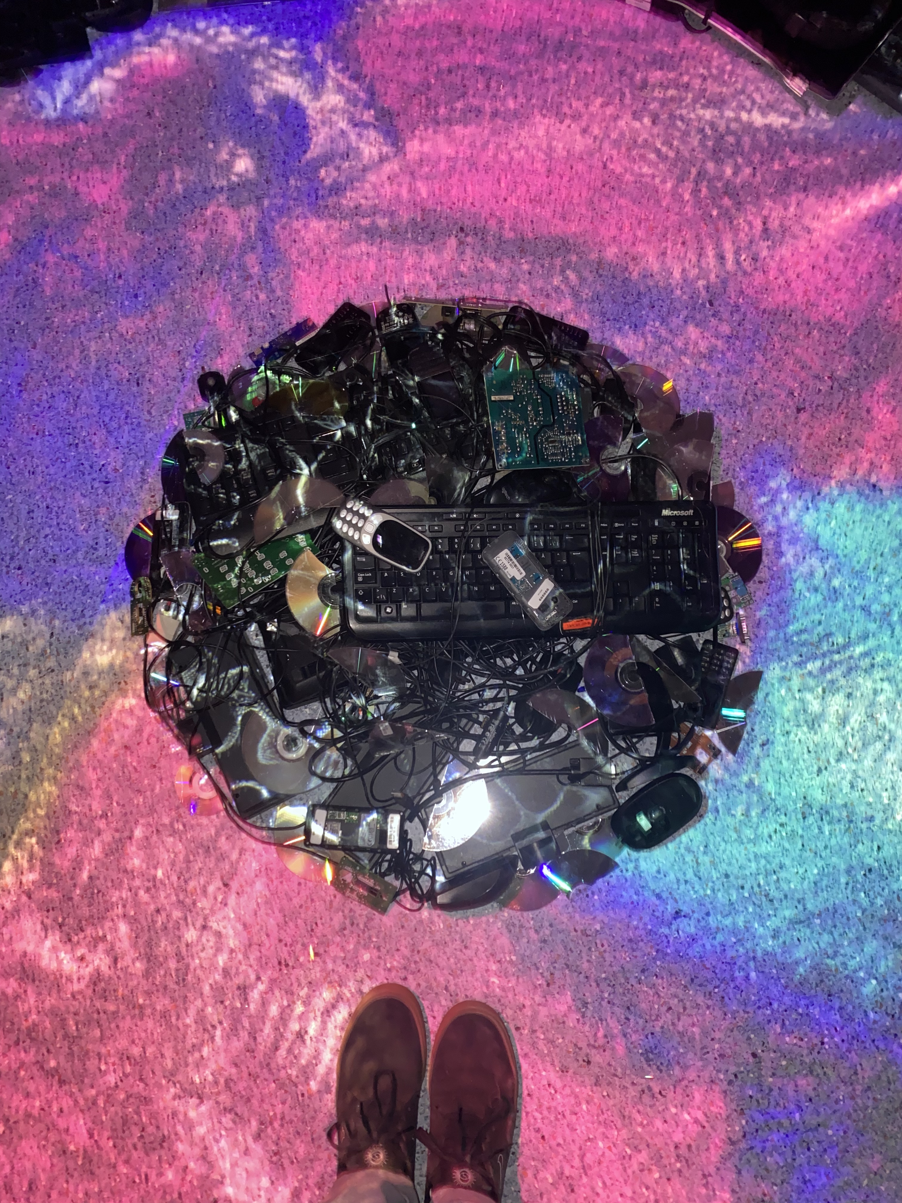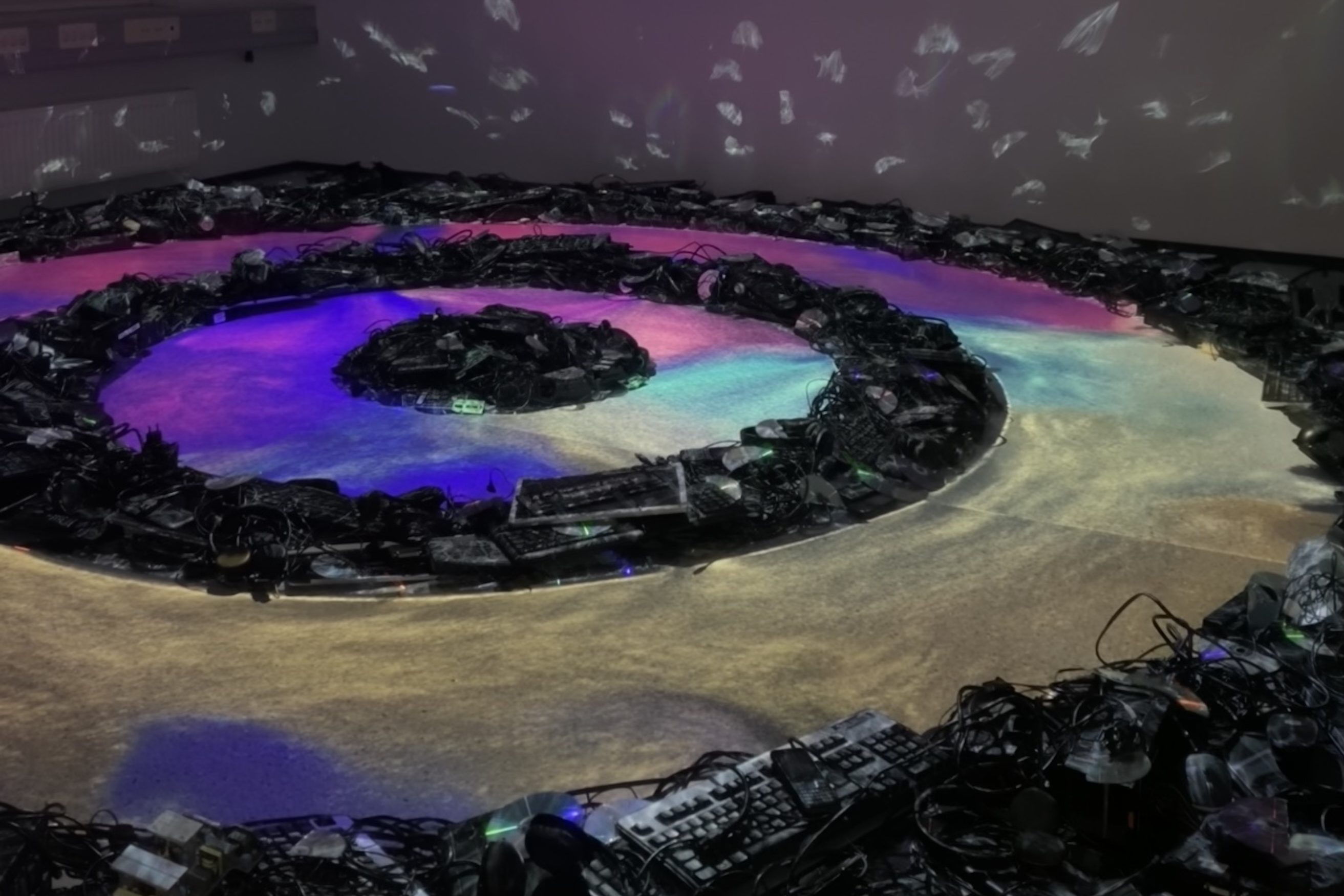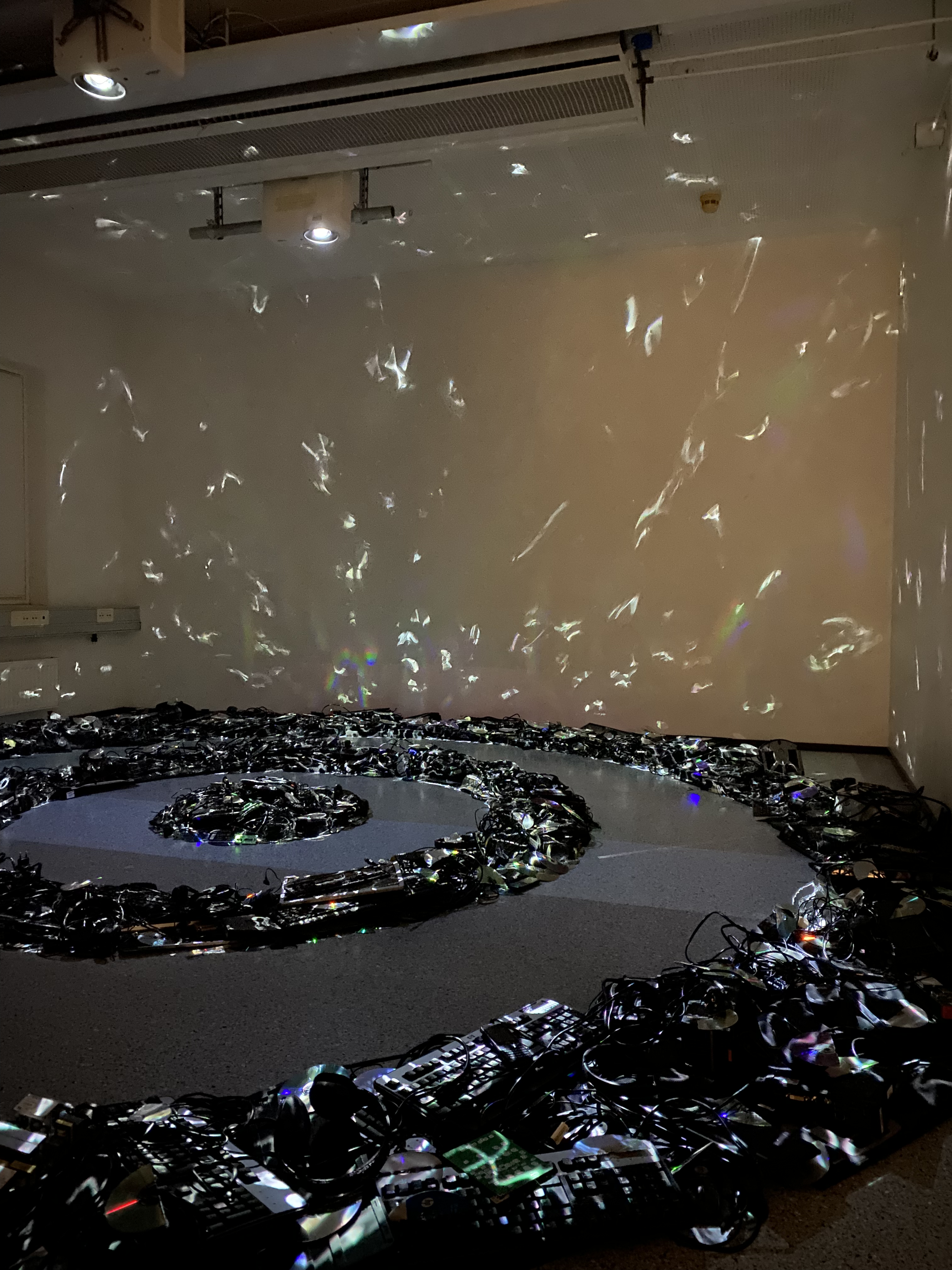 Teos muodostuu entisen n. 30 m2 kokoisen toimistohuoneen keskelle sijoitetuista pyöreistä elektroniikkajäte-kehistä jotka on herätetty eloon projisoidulla valotaiteella. Teos on toteutettu kahden taiteilijan (Emc & Sarri) yhteystyönä.
